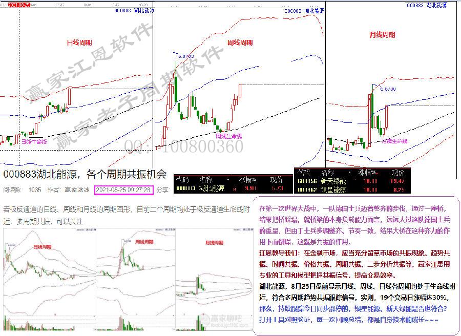 湖北能源,8月25日盤前顯示月線、周線、日線各周期均處于生命線附近,符合多周期趨勢共振跟蹤信號。實則,19個交易日漲幅達30%。那么,持續跟蹤今日同步漲停的,銀星能源、新天綠能是否也符合?打開工具對照驗證,每一次回顧總結,都是自身技術的成長~~~