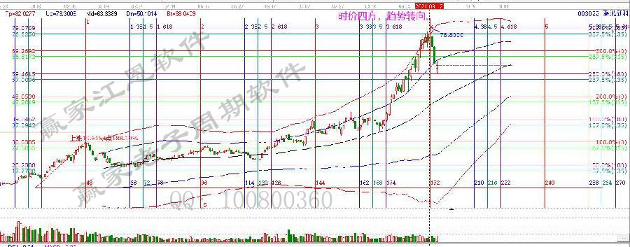 在日線做時空細化分析圖,一組江恩螺旋時間、一組江恩波段百分比,即可直觀顯示波動旋律。