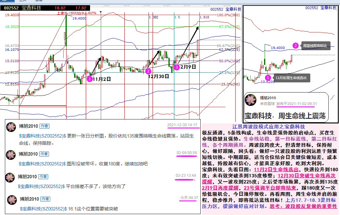 寶鼎科技,先看日圖:11月2日生命線選出,快速拉升到180度;未有效突破殺到135度修整;12月30日突破生命線再次提醒,又一波攻到225度;之后受市場拖累,再次殺到135度2月9日再度提醒,23號強調平臺即將結束,踩180度又一次給低吸機會,今日漲停報收。再看周圖,周生命線開啟的旅程,穩步推升,即將抵達藍線目標!上方17.7-18.3是目標壓力區,提前做好應對計劃。思考:波段股反復做的重要性!