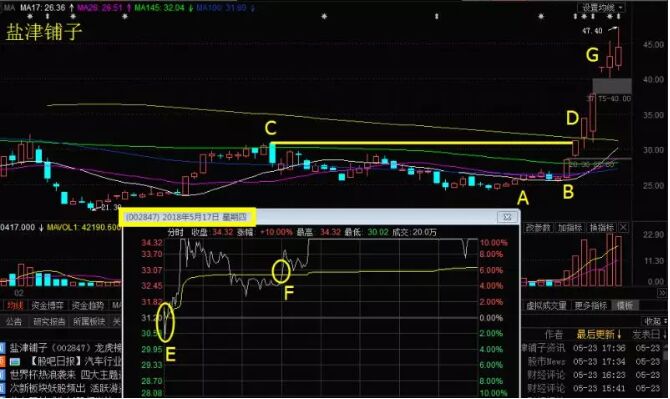 E圓圈內,是該股直接低開后在當日分時上形成的一個低點,大膽的投資者在這里會先介入一部分。然后等到股價返回均價之上時再介入一部分。小圖中黃色的線便是股價的當日平均成本價,當股價站回其之上后,可視為洗盤結束。如果在D點這一天成功介入的話,當日股價便收上漲停。要知道D點位置附近臨近年線,而年線也是最后一道壓制均線,股價一旦突破這個位置,上方空間將被打開。