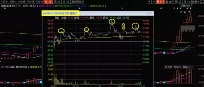 D點介入之后的賣點在哪里呢?我們繼續看圖,編號G的那筆陽線大家看出什么端倪了嗎?也就是2018年5月22日,收了一根上下影線均較長的K線,不得不使我們要懷疑主力的企圖。再來看那一天的分時圖。