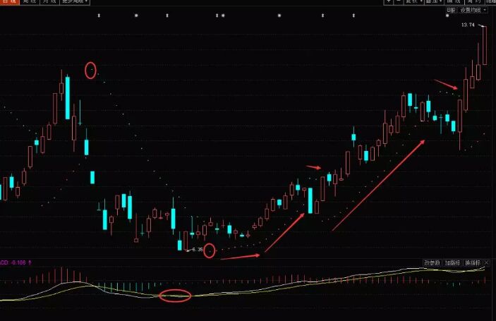 如上圖所示,當股價在相對低位的時,空方力量釋放完畢,K線突破拋物線,在拋物線之上盤整運行,之后開始一波稍稍強勢的上漲,而拋物線上升角度變得陡峭,說明多方力量較強。當K線一直下跌時,拋物線為綠線,表明空方力量強勢。一般拋物線下跌角度越大,則股票下跌速度越快,下跌幅度越大,維持時間越久。拋物線上漲角度超過45度,則基本可以確定上升趨勢已經穩固,K線出現陰線調整時,可以選擇進場。