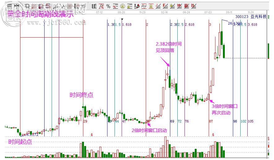 圖形解析:亞光科技,以2018年10月19日低點到2019年5月17日高點的周線為起始周期。同時保留最關鍵的0.382、0.5、0.618分割位。可以看到,股價在2倍時間窗口啟動拉升,在2.382倍時間窗口拐點向下,3倍時間窗口再次啟動趨勢拉升行情。兩波大幅度上漲行情,都是出現在倍數位,可通過該工具完美把握。因此,接下來的4倍時間窗口就尤其關鍵了。